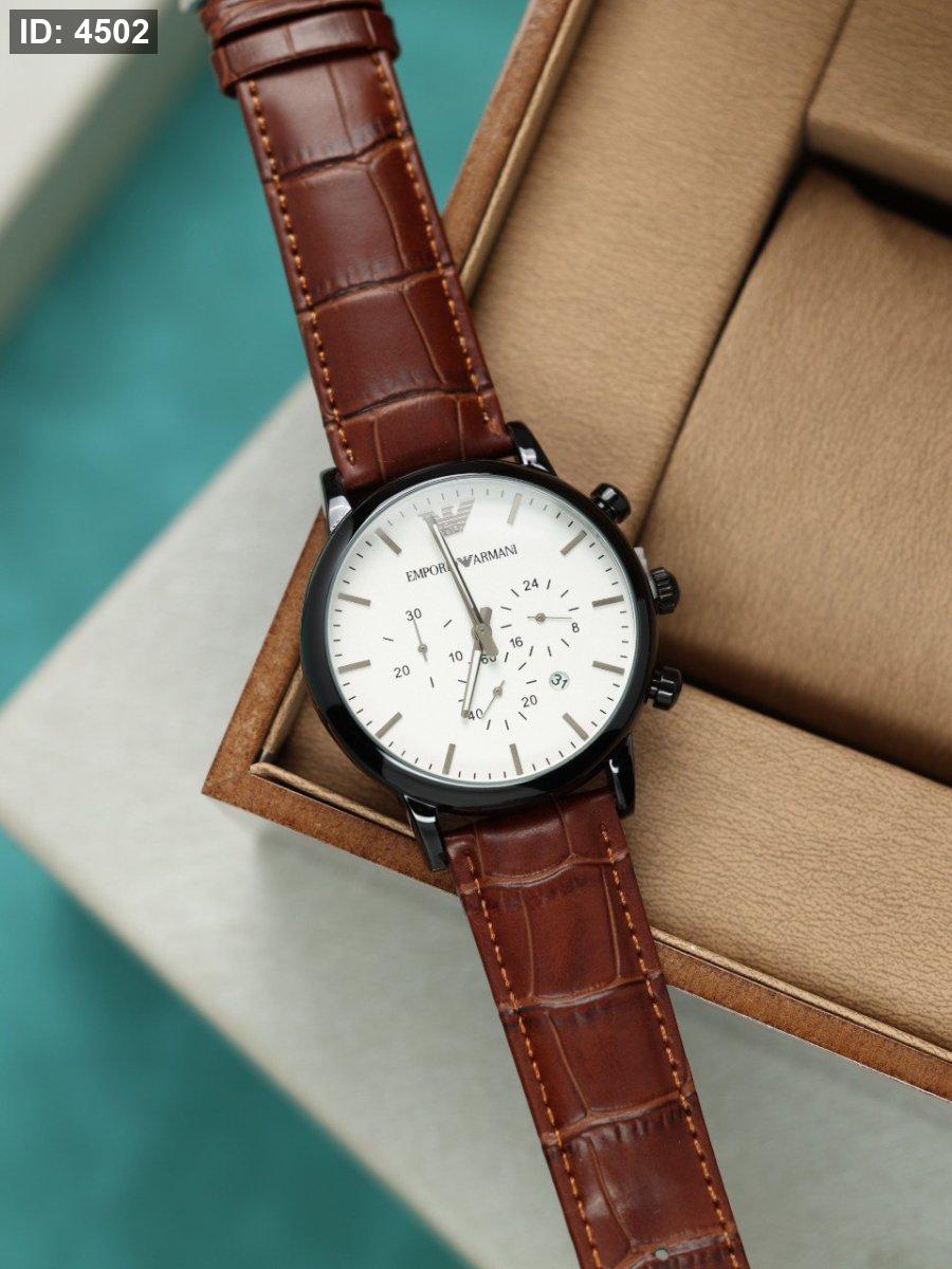 ساعة ارماني رجالي جلد (ساعة + علبة فخمة)